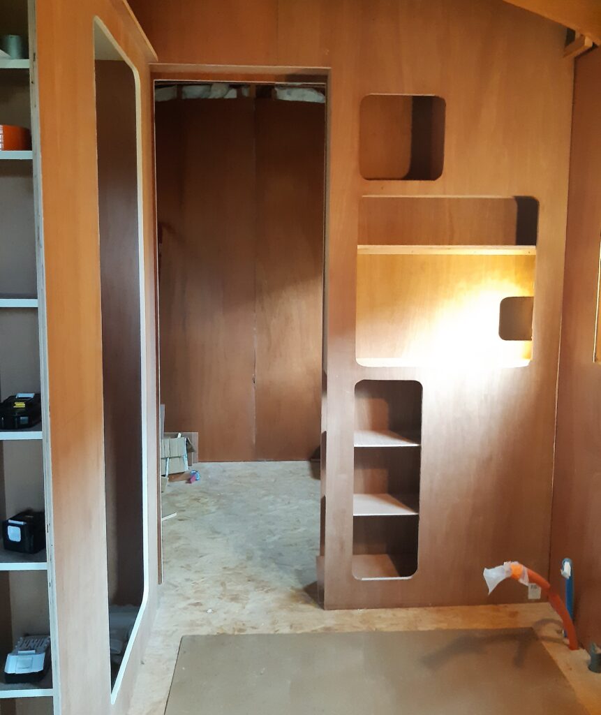 En hier in elkaar gezet. Aan de linkerkant plankjes voor boeken en de deuropening naar de douche, in het midden toegang tot het slaapgedeelte en aan de rechterkant de keuken. De deuren en schuifladen volgen later.