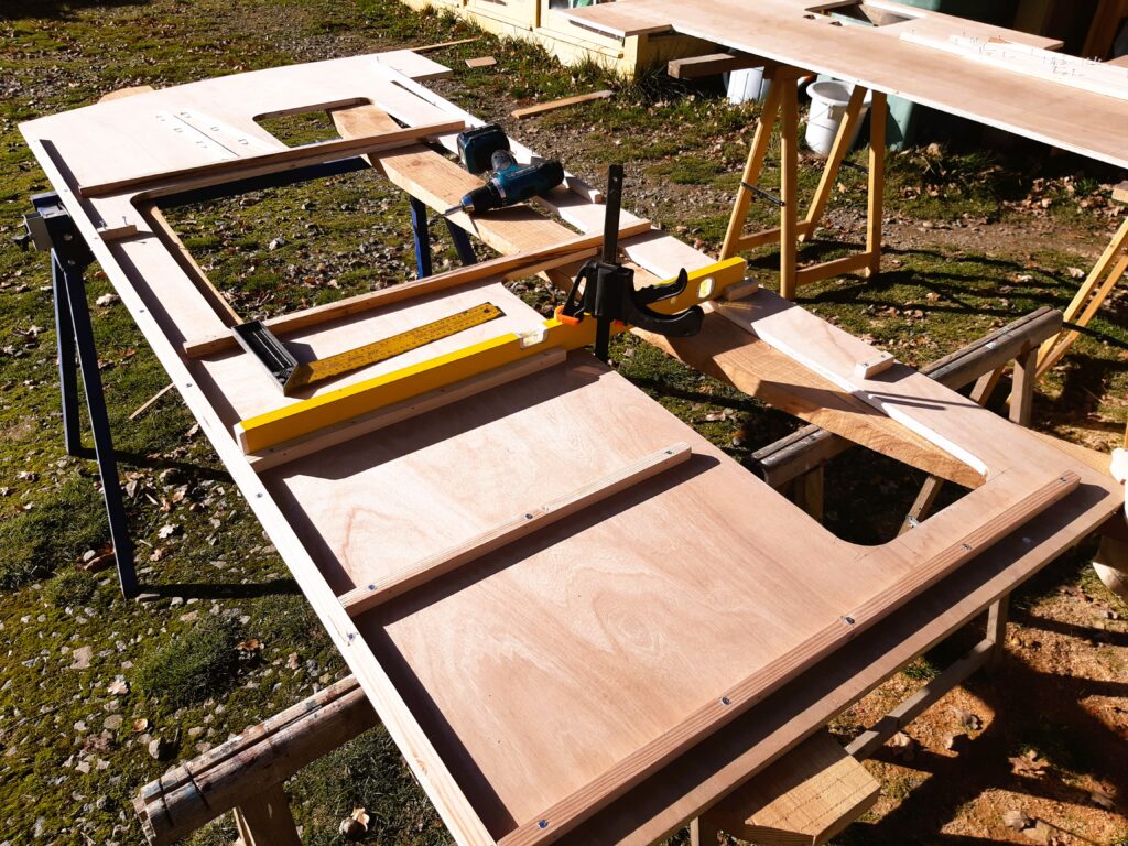 Proefondervindelijk vastgesteld: van oude kastdeuren moet je geen wc-deur voor buiten maken, ook niet als er een dak boven zit. Ze trekken krom bij droogte en klemmen zich vast wanneer het vochtig weer is. Dat wil je niet bij grote nood.