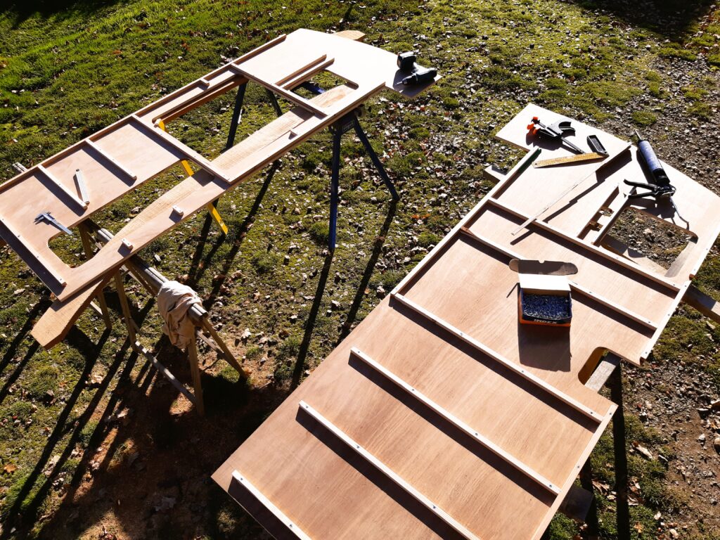 Et voilá, le tout assemblé. À gauche, des étagères pour les livres et l’ouverture vers la douche ; au centre, l’accès à l’espace nuit ; et à droite, la cuisine. Les portes et les tiroirs suivront plus tard.